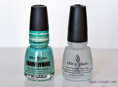 China Glaze's Tranzitions collection is a set of six very interesting polishes. They're not like ordinary polish. They're one color when you apply them, but adding a coat of topcoat changes them into a different color. Hence the name Tranzitions.